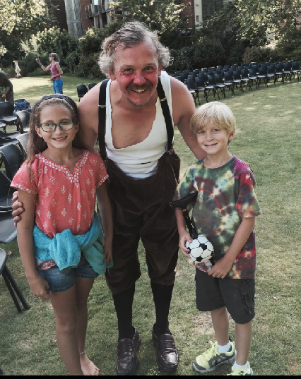 Photo = Andrew Murton, just after playing an exuberant and captivating Falstaff at the Charity performance on August 1st (and a crash diet!), kindly posed with Jeanne Marie and Henri Landry from New Orleans for this photo.